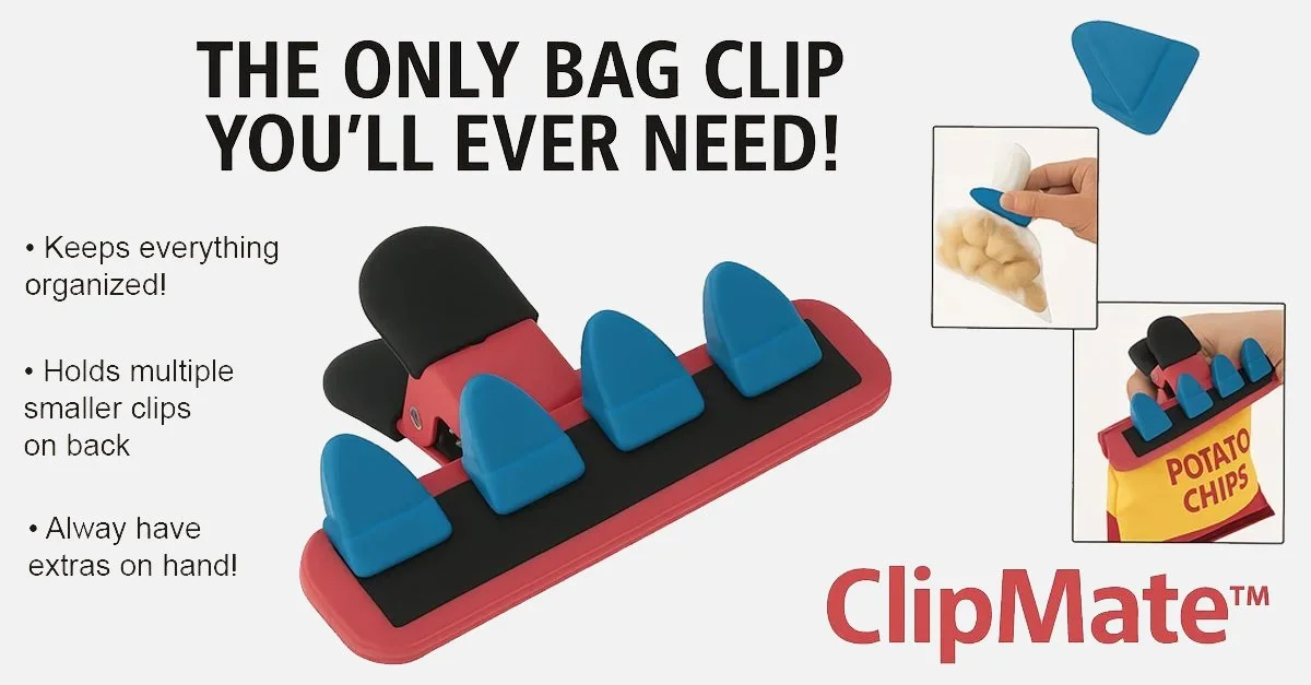 ClipMate™ is a smarter, patent-pending bag clip system that solves a familiar consumer frustration: never having extra clips when you need them.
