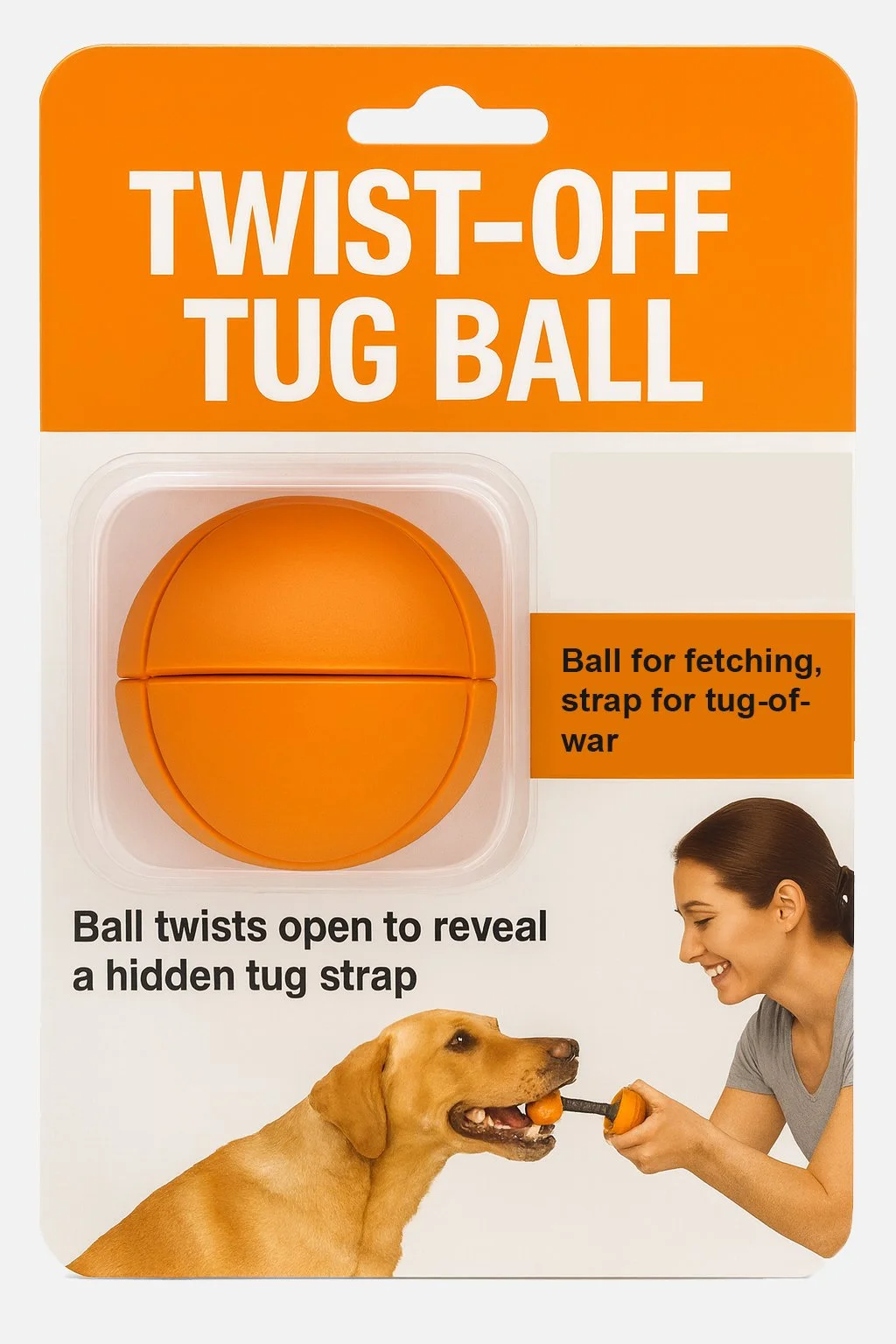 The Twist-Off Tug Ball™ is a patent-pending dog toy that transforms playtime with a simple twist. At first glance, it’s a durable fetch ball. But give it a turn, and the ball opens to reveal a hidden, built-in tug strap—turning the same toy into a tug-of-war game instantly.